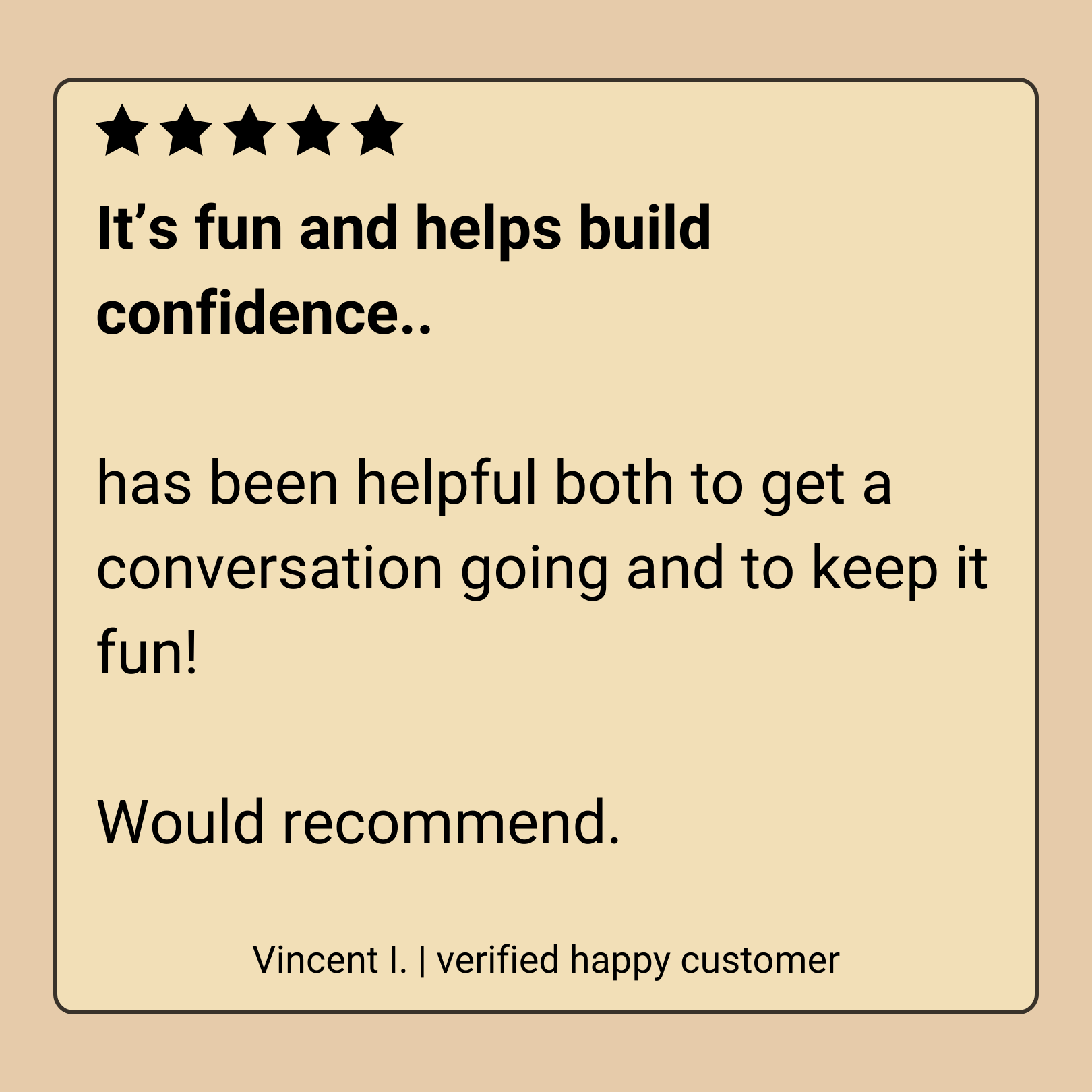 We guarantee our game will spark your favorite conversations. Try it with a few people, and if it doesn't deliver memorable moments, simply request a refund. Jo, our customer happiness manager, will take care of you.