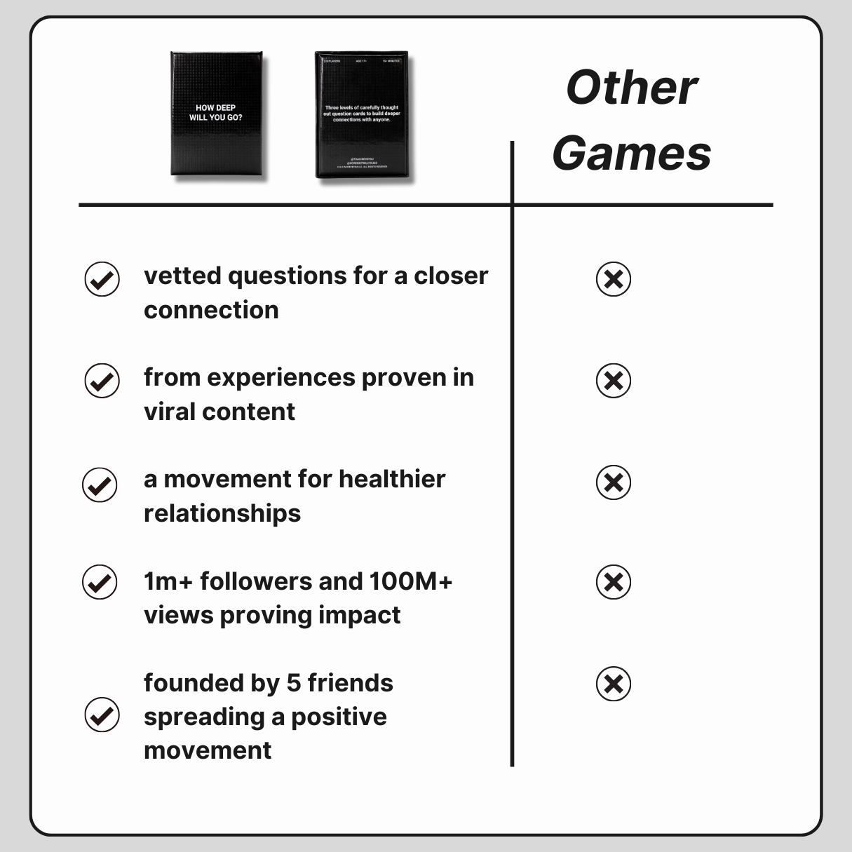 This is a game of deep questions that brings you closer to someone every time you play, even with people you've known for years. '